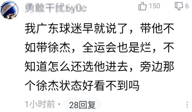 胡明轩对阵韩国队接二连三的拉胯,自然就免不了赛后球迷对他的一番批评和嘲讽,有球迷直接嘲讽,这就是我们CBA联赛的FMVP?也有广东球迷认为:带他不如带徐杰,全运会也是烂,不知道怎么还选他进去?